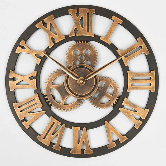 Industrial Gear Wall Clock, 15.7" Silent Non-Ticking, Roman Numerals, Black & Gold Decor