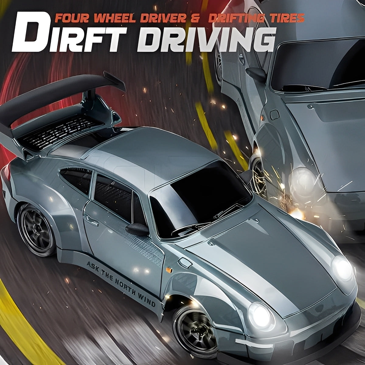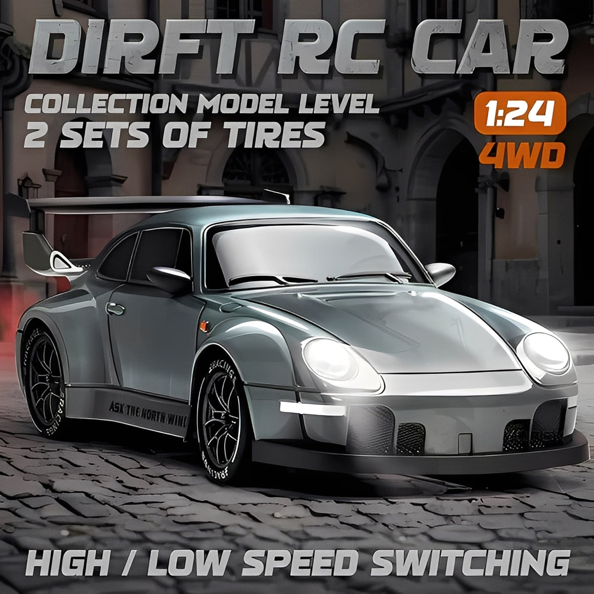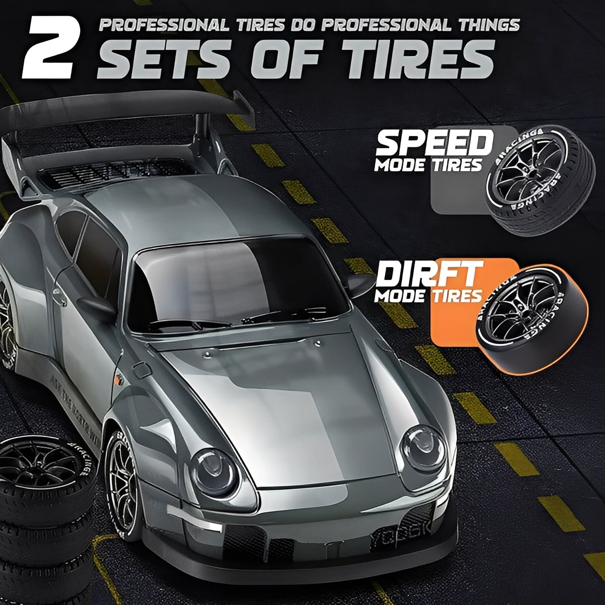 This RC car blends modern technology with a classic aesthetic. The 4WD vehicle features adjustable driving options for alternating between high-speed racing tires and drifting tires.
