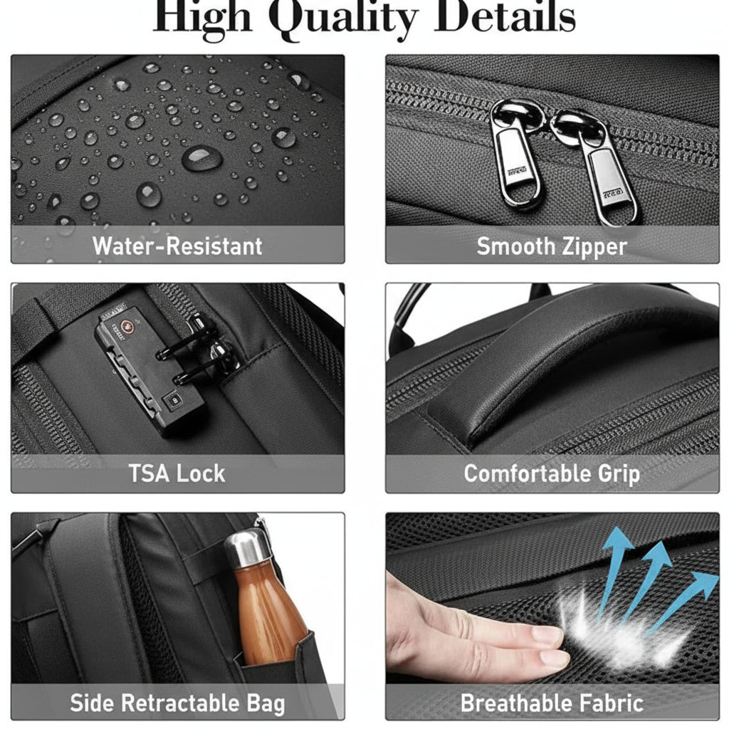 The rucksack has multiple adjustable compartments for different storage needs. This includes a separation for dry and wet items, which helps maintain organization. It is suitable for work, travel, or daily use.