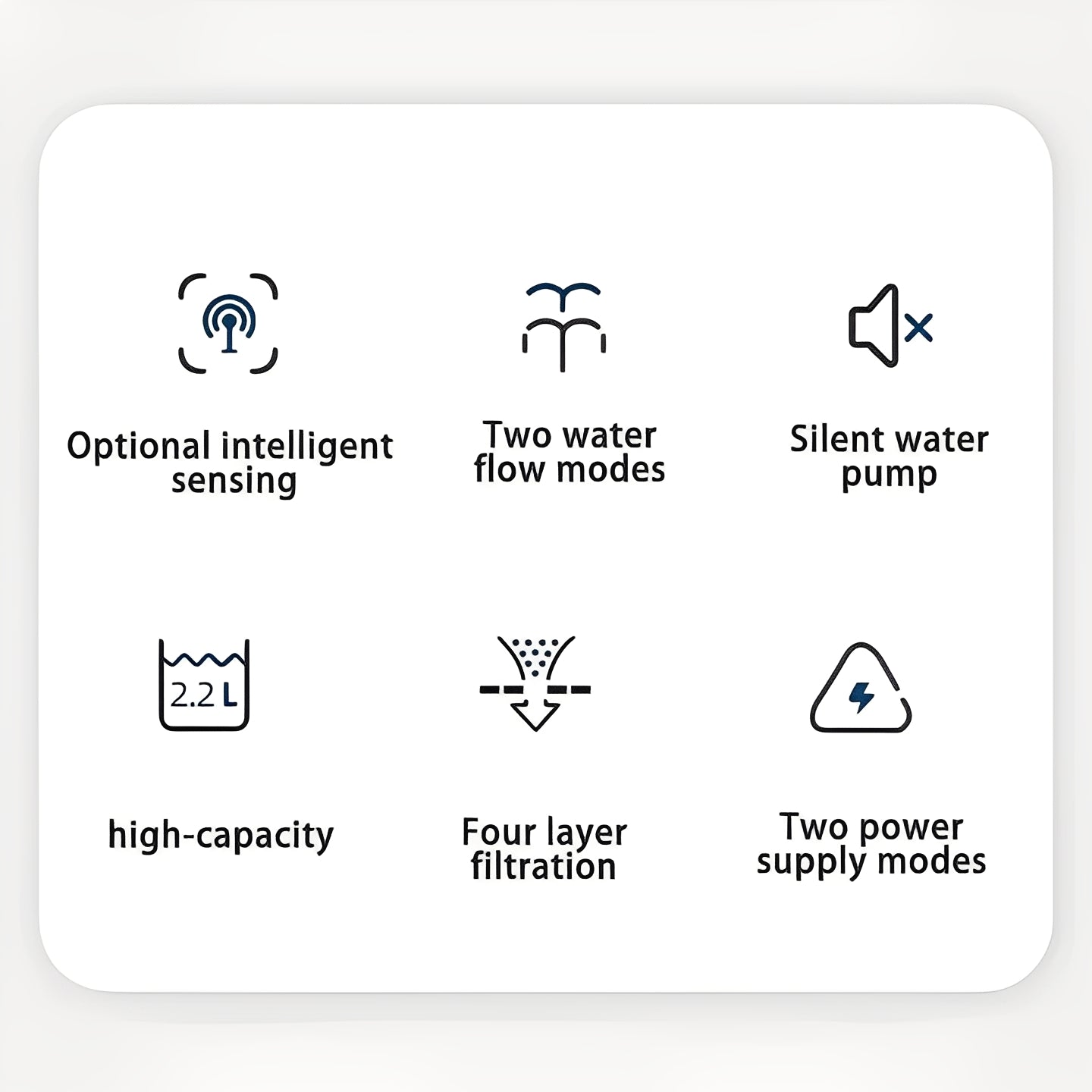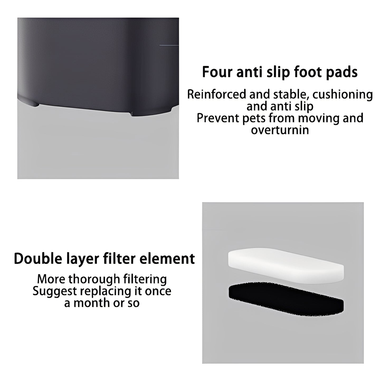 Engineered for low-noise operation, the motor is designed to run quietly. The base includes rubber pads to help keep the unit stable during use. The fountain is constructed with smooth edges and can be disassembled for cleaning with standard household solutions.