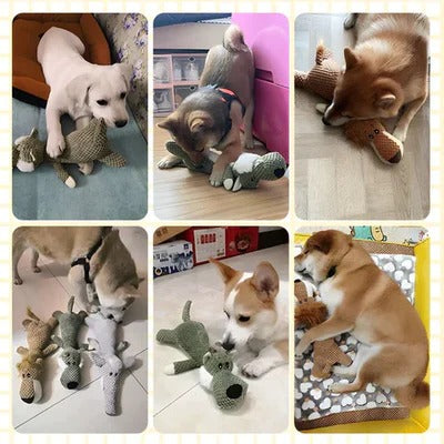 The toy is made from fabric with reinforced stitching and embroidery intended to improve durability during regular chewing and pulling. The textured material may provide light friction during chewing. Toy lifespan varies based on dog size, bite strength, and play habits.