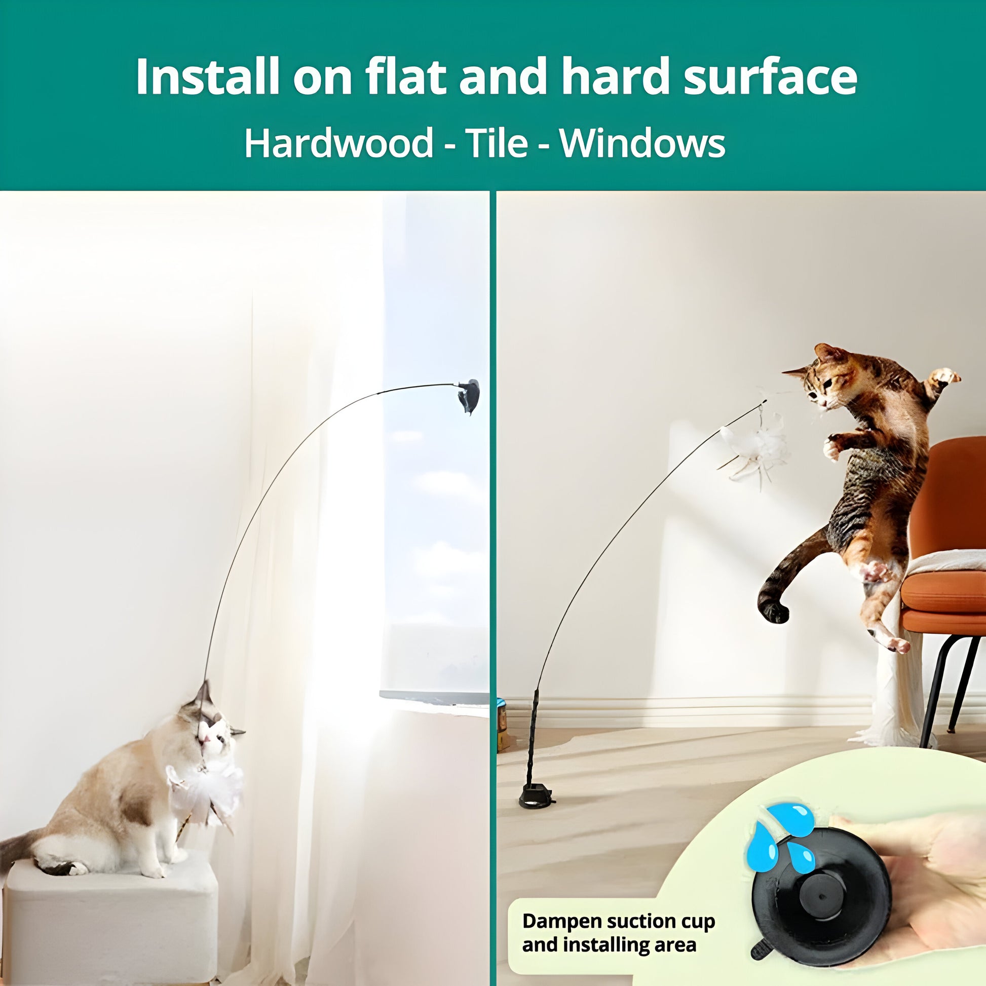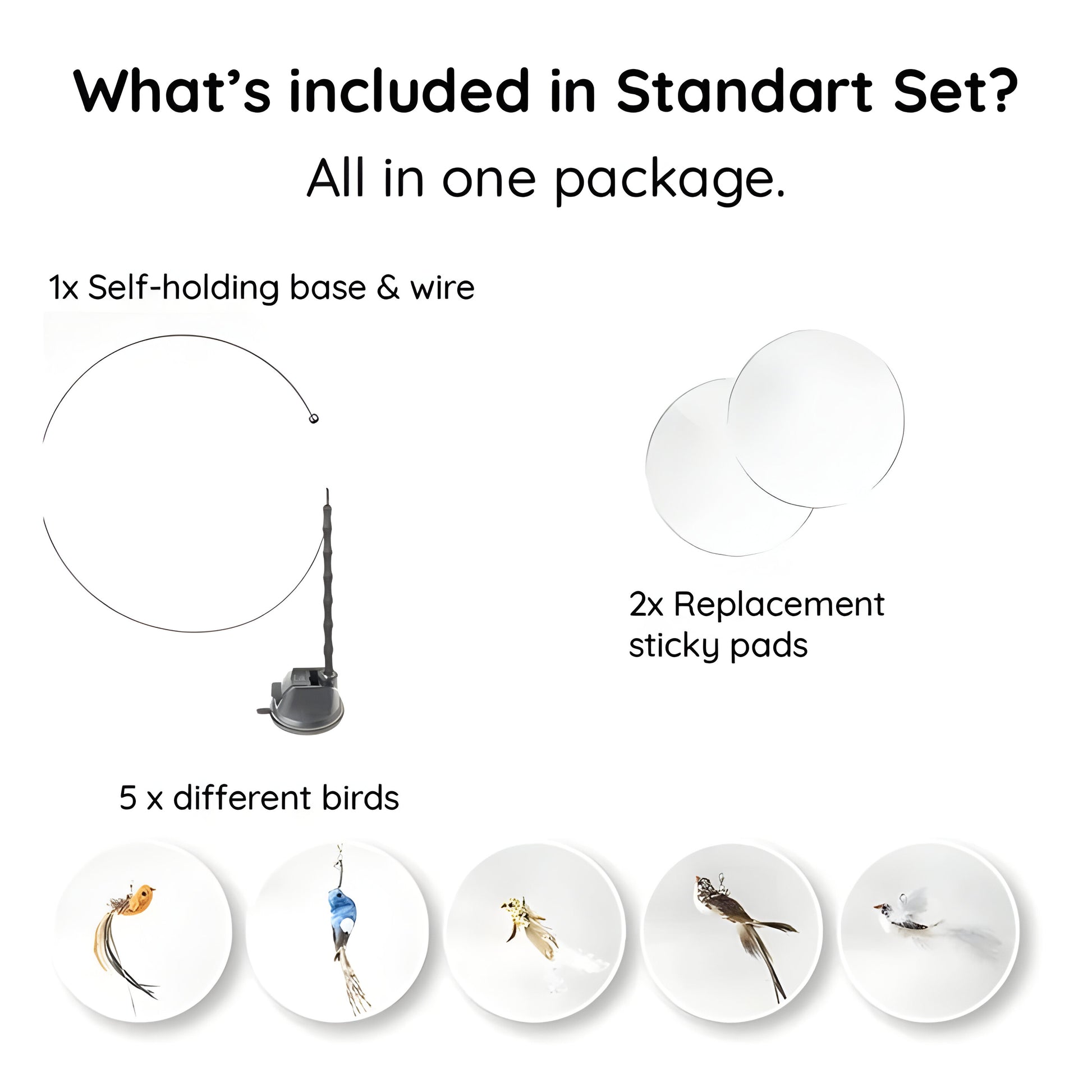 This interactive toy set is designed to mimic the movement of birds. It features a sturdy suction cup base that attaches to flat, clean surfaces for horizontal or vertical placement. The movement is intended to engage the animal's natural instinct to chase and bat.