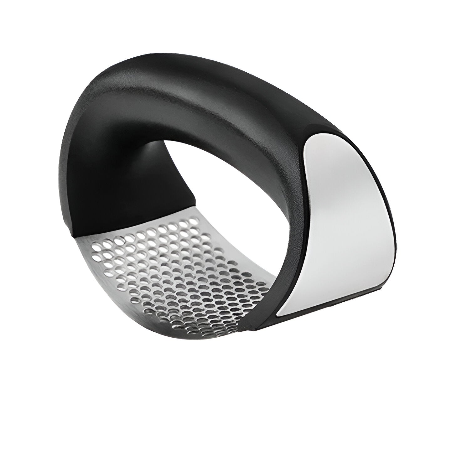 This garlic press features a curved structure designed for crushing garlic or mincing ginger. Its compact form allows it to be used for daily tasks and fits various kitchen setups. The press is lightweight and compact for storage when not in use.