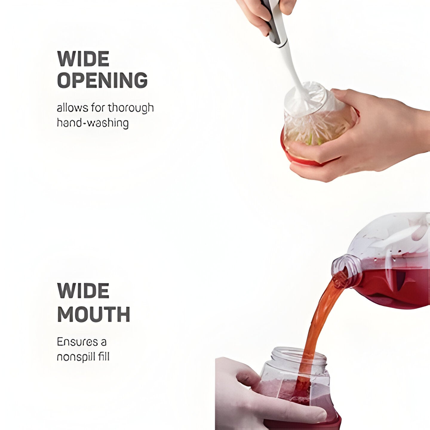 Twist apart the two-piece base, hand-wash or top-rack dishwasher-safe components, refill through the wide mouth, then reassemble.