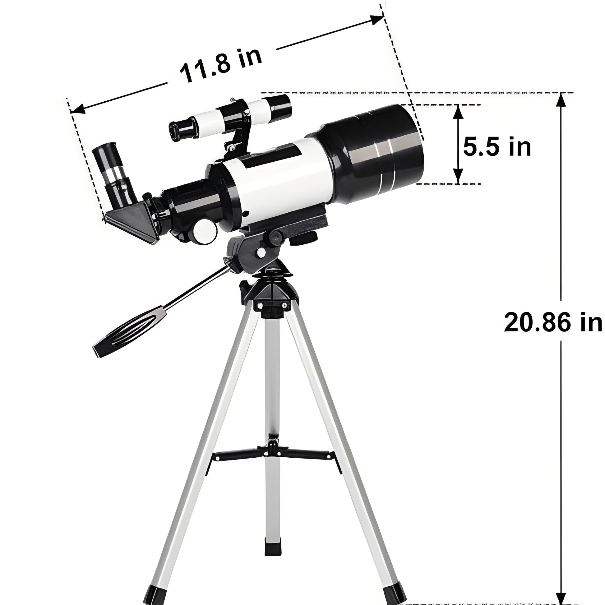 Featuring a 2.76-inch (70mm) aperture and an 11.81-inch (300mm) focal length, this telescope gathers light to deliver images of celestial and terrestrial objects. The included phone attachment allows you to mount a smartphone to take pictures of the view.