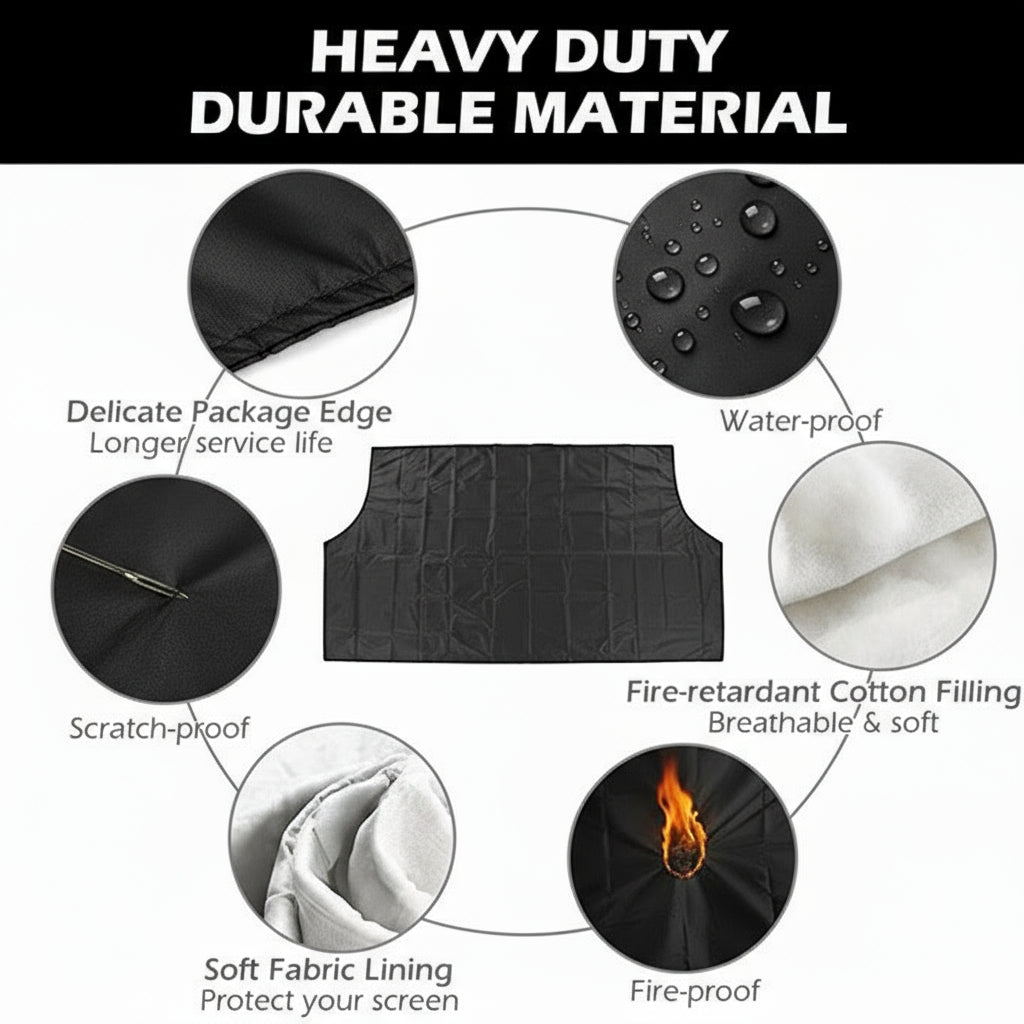 This cover is engineered to stay in place during typical outdoor conditions. It features six magnets along the top edge for secure placement, plus two windproof straps on each side for added security. Made from durable, water resistant polyester fabric designed to shield from snow, frost, and sunlight.