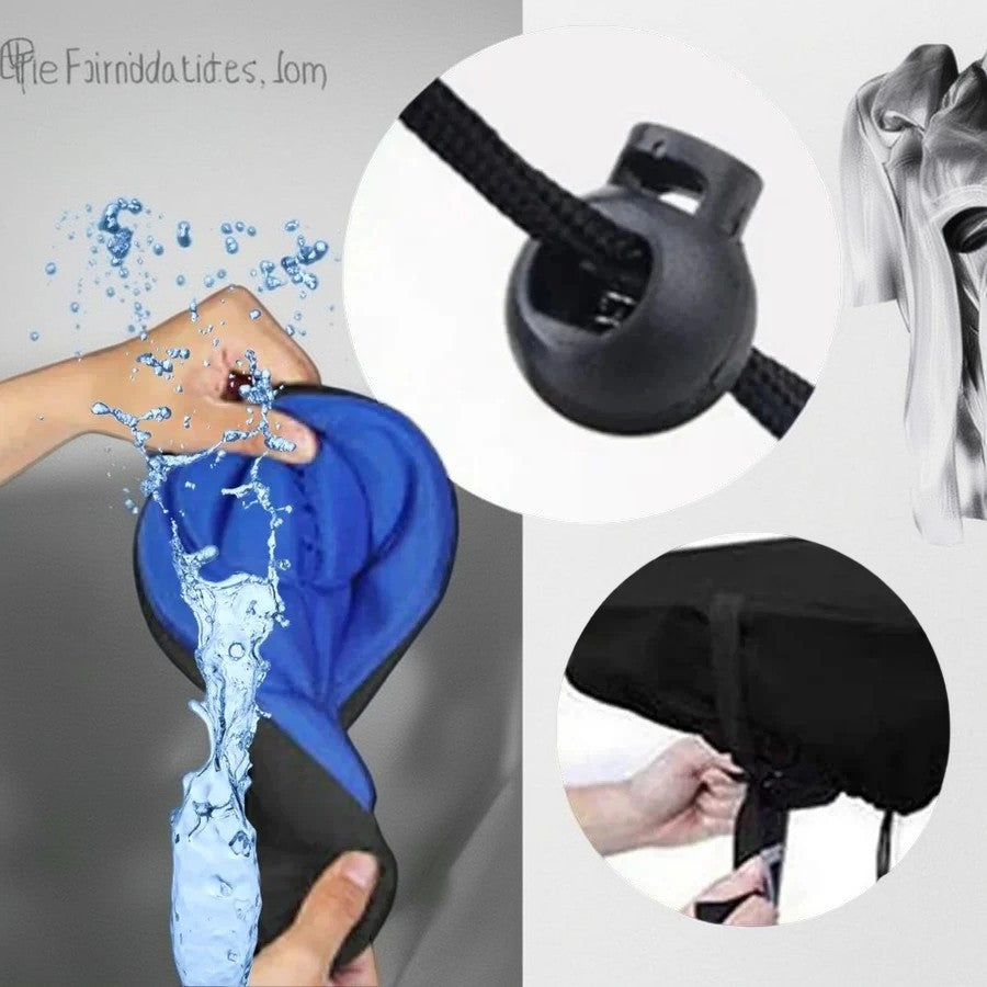 A built-in drawstring allows for a secure and adjustable fit on different saddle shapes. This fastening system helps prevent shifting while riding. The cover is washable by hand with soapy water or in a washing machine, making maintenance straightforward.