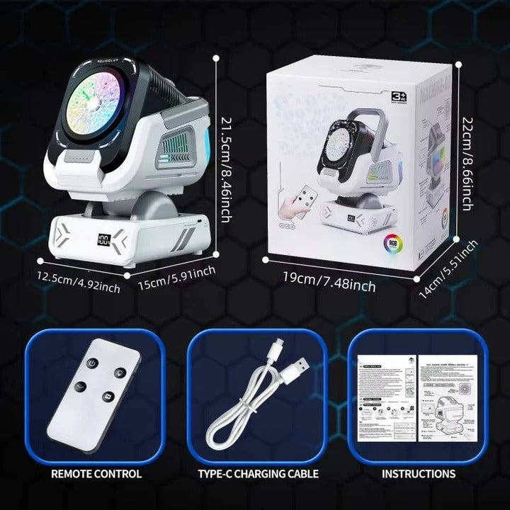 This device is powered by a built-in 1800mAh rechargeable battery, which provides over 90 minutes of runtime. A battery level display is included so you can monitor the remaining power. The unit charges via a standard Type-C port. For nighttime use, it is equipped with nine RGB colors to illuminate the bubbles.
