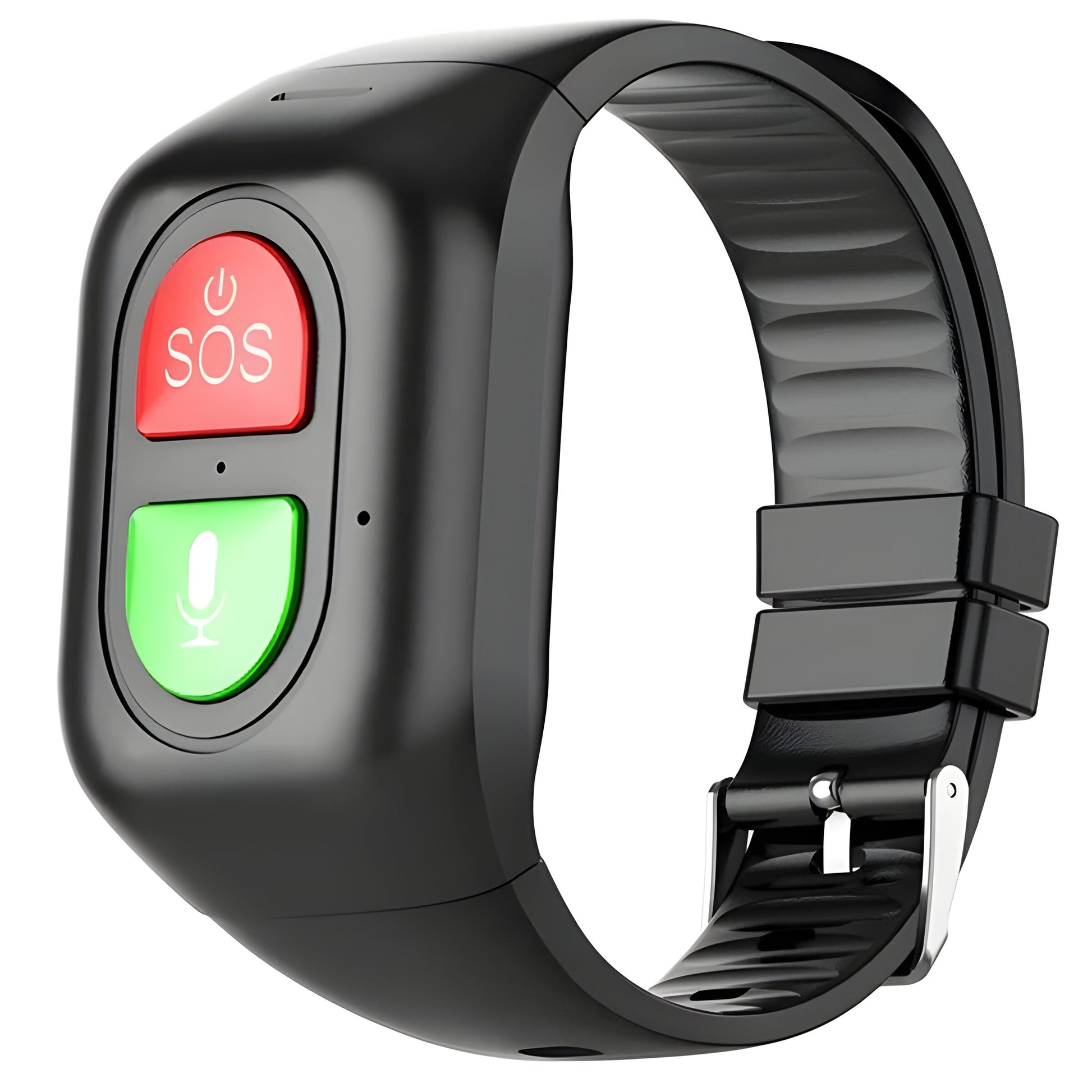 The watch has a built-in SOS button. When this button is pressed, the watch is designed to send an alert and the wearer's location to designated contacts. It uses a combination of GPS, WiFi, and LBS positioning for location tracking, which can be viewed through a mobile app. The app also allows for setting up "safe zones," with notifications sent if the wearer moves outside these areas.