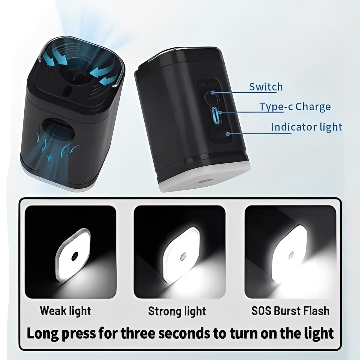 The pump is powered by a rechargeable battery and uses a Type C charging port. The device includes a built-in LED flashlight with three modes: weak, strong, and SOS flash.