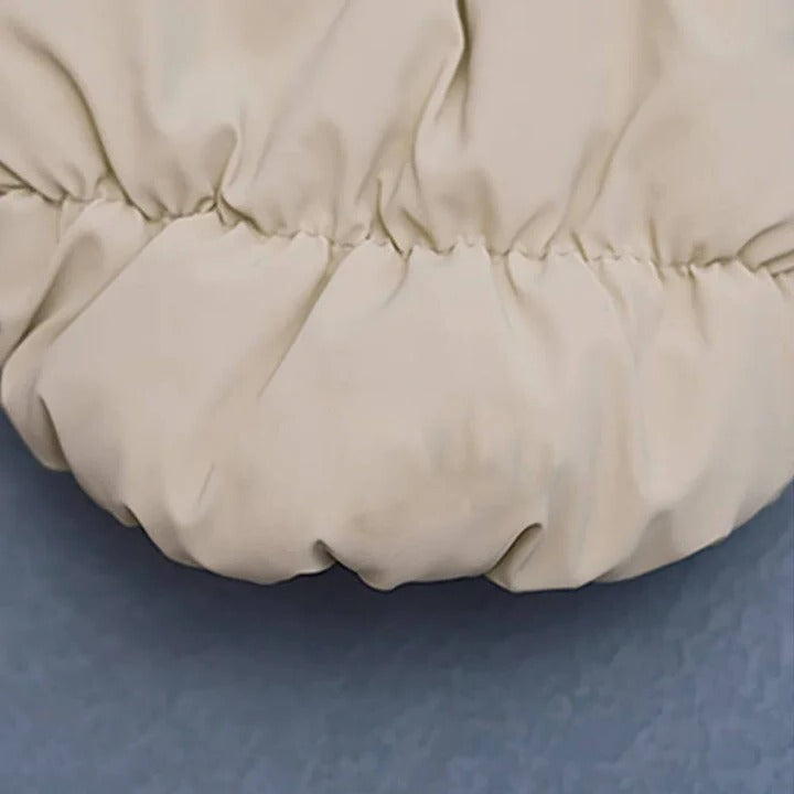 The outer layer is constructed from cotton fabric, intended to provide a barrier against wind. Inside, the jacket is lined with velvet fleece, which is designed to help retain body heat. A high collar is incorporated into the design to offer coverage for the neck area during cold weather.