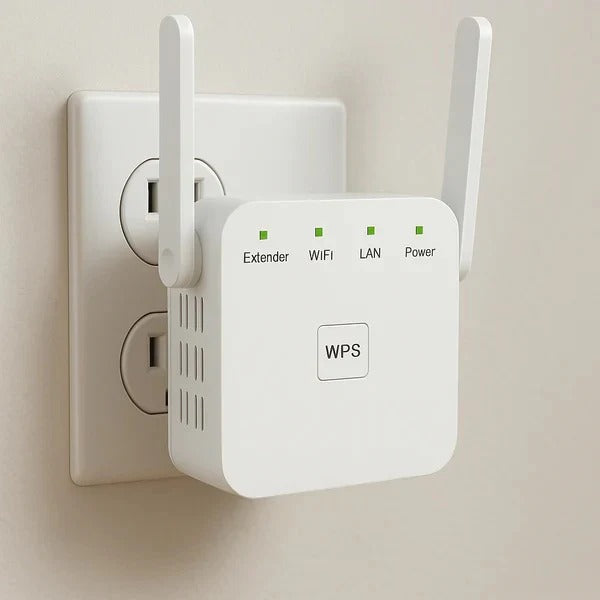 This WiFi booster utilizes dual-band technology (2.4GHz + 5GHz) to ensure efficient signal distribution across multiple devices. It connects to your existing router to amplify internet coverage, providing high-speed connectivity suitable for streaming, gaming, and video calls without lag. The device supports speeds up to 300 Mbps.